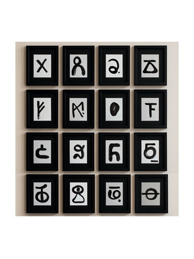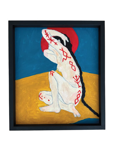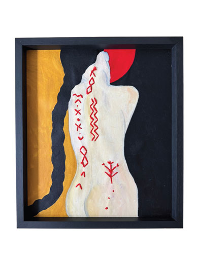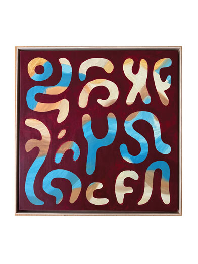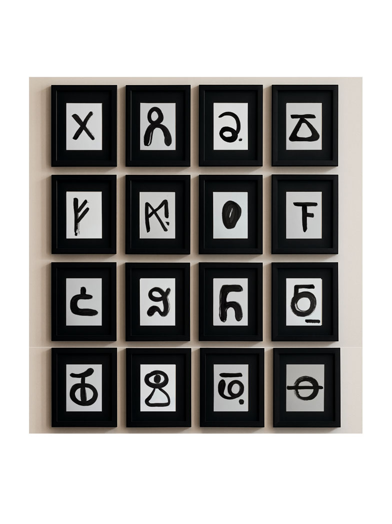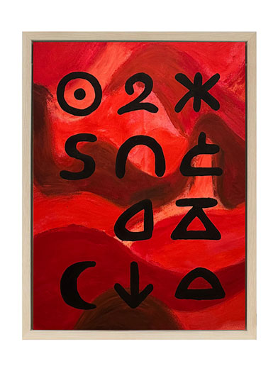 In Imagined Language, Lisbon-based artist Daria Muhina creates a visual alphabet for moments when words are no longer enough. Drawing on memory, folklore, and private mythology, she replaces letters with invented glyphs, tactile marks, and recurring motifs such as the apple, the bird, and the rune. Painting, embroidery, and textiles intertwine into a language of belonging that resists grammar yet speaks through emotion and bodily resonance.