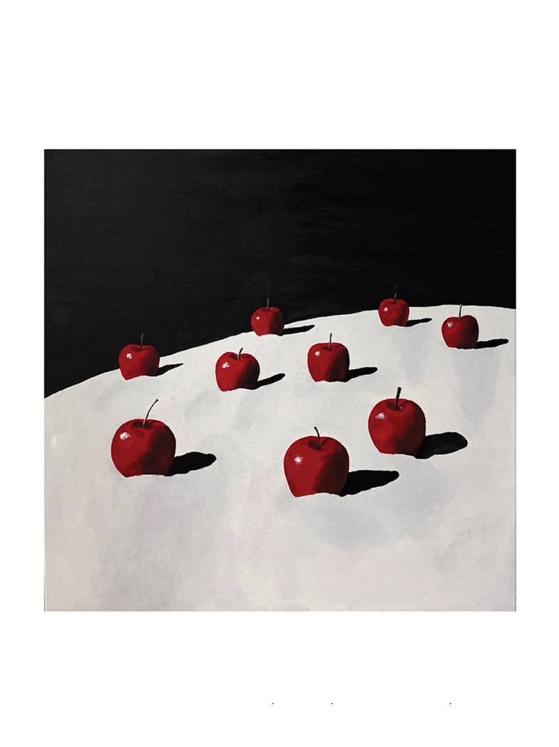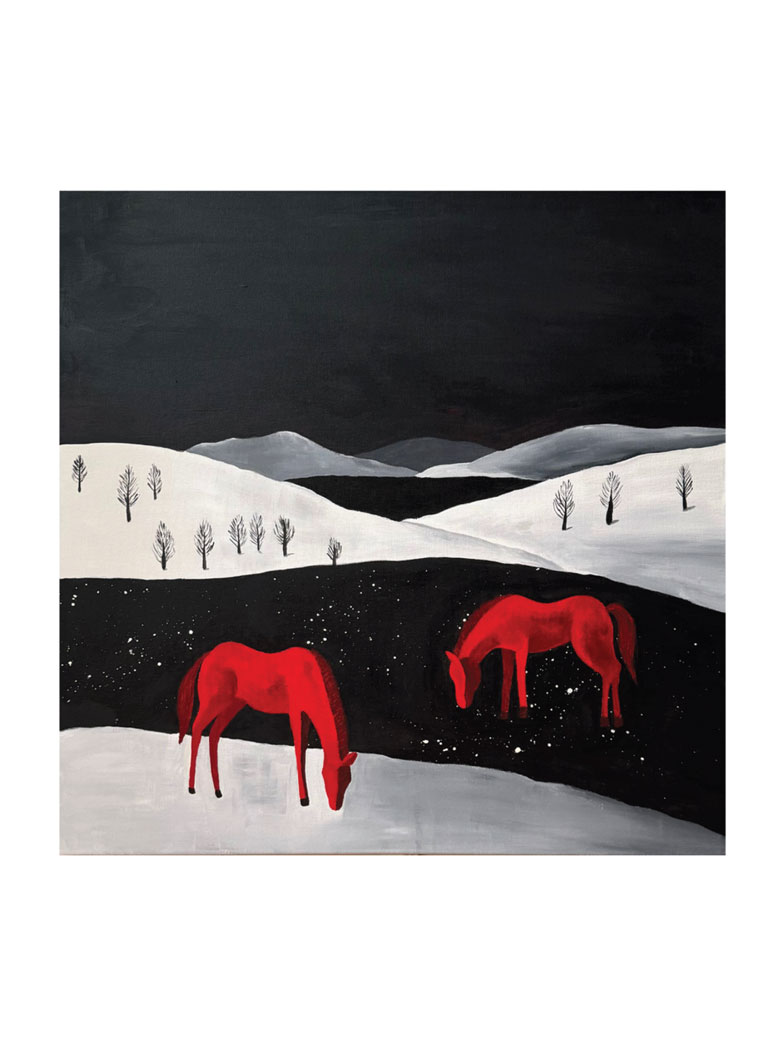 In these works, red becomes a symbol of memory, warmth in the cold, a mark left on the white surface of time. These landscapes are linked to childhood memories, the sense of winter silence and a space that feels both open and vulnerable. Nature here is almost symbolic: it is both a real winter forest and an inner landscape, a reflection of experience.