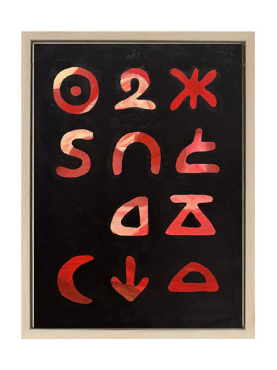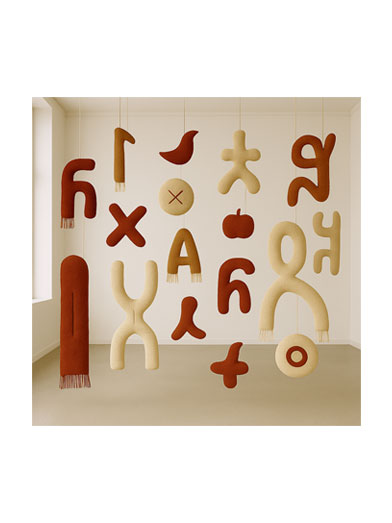 The installation Translation extends this system into space: suspended textile forms echo painted symbols, inviting viewers to walk among them. Here signs transform from flat marks into spatial bodies, becoming characters for dialogue and interpretation.