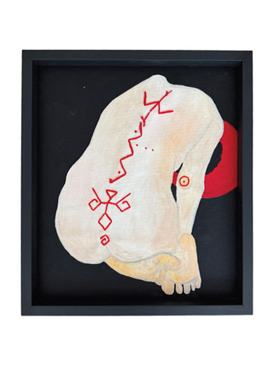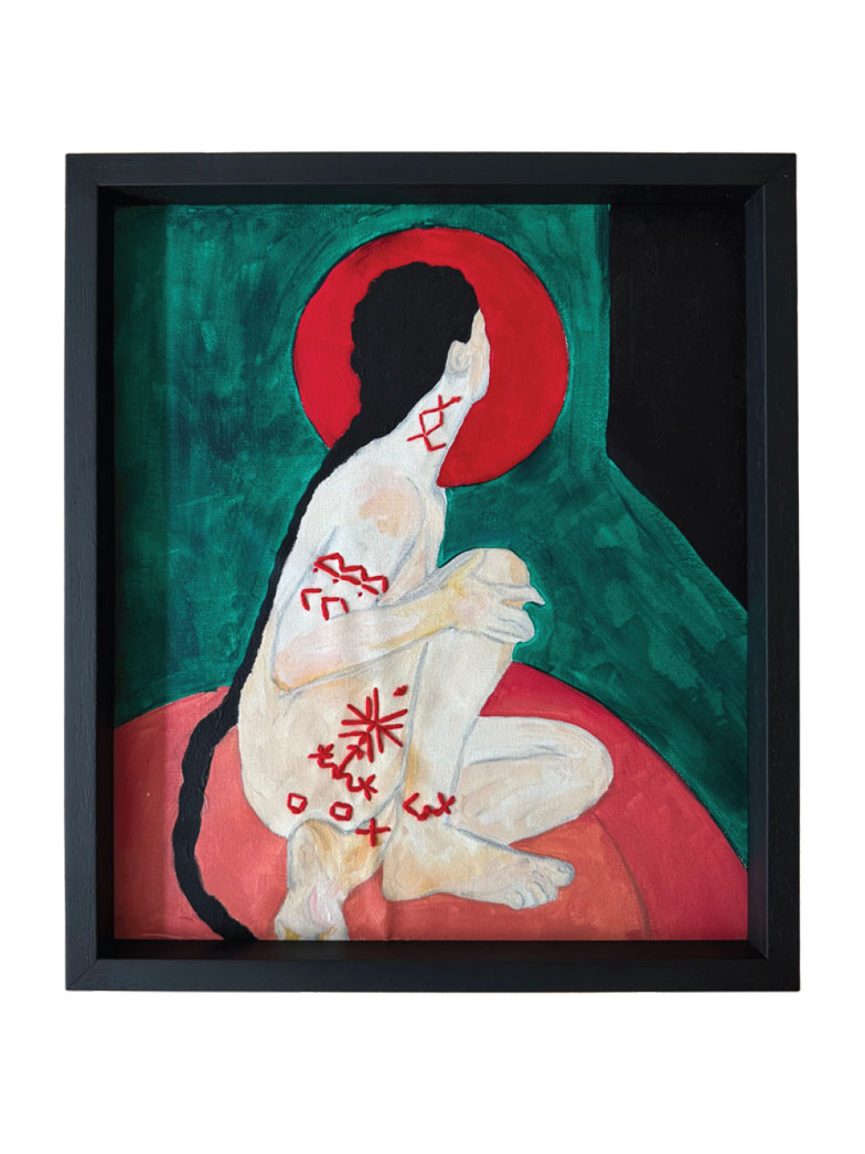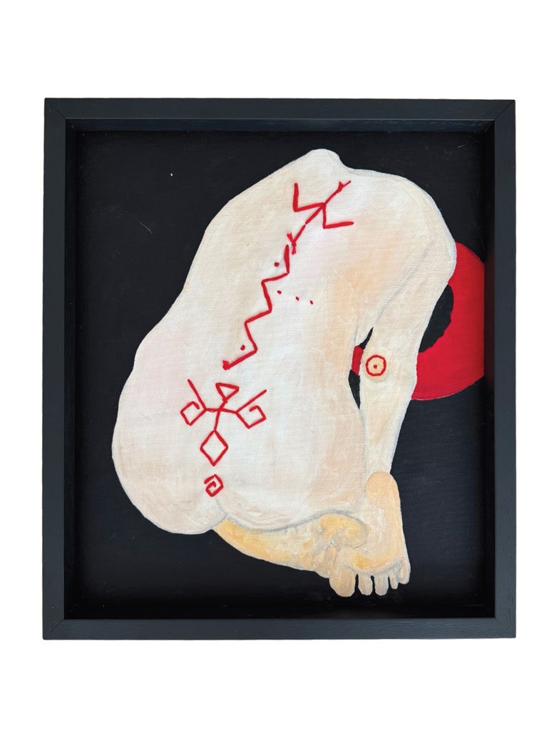 The embroidered bodies: sometimes a scar, sometimes a shield, sometimes an attempt to regain control. The red thread is pain, healing, and ancestral memory. In Russian, “Oberég” is a noun derived from the verb ‘to protect’, and as in these works, it can be embroidered, woven, spoken, or made from natural materials. As an attempt to listen to nature — within the self, within the body, and within ritual — these works connect woman and nature not through fragility, but through cycles. The ability to renew, to enter silence, to die, to be reborn, and to continue is our soft power.